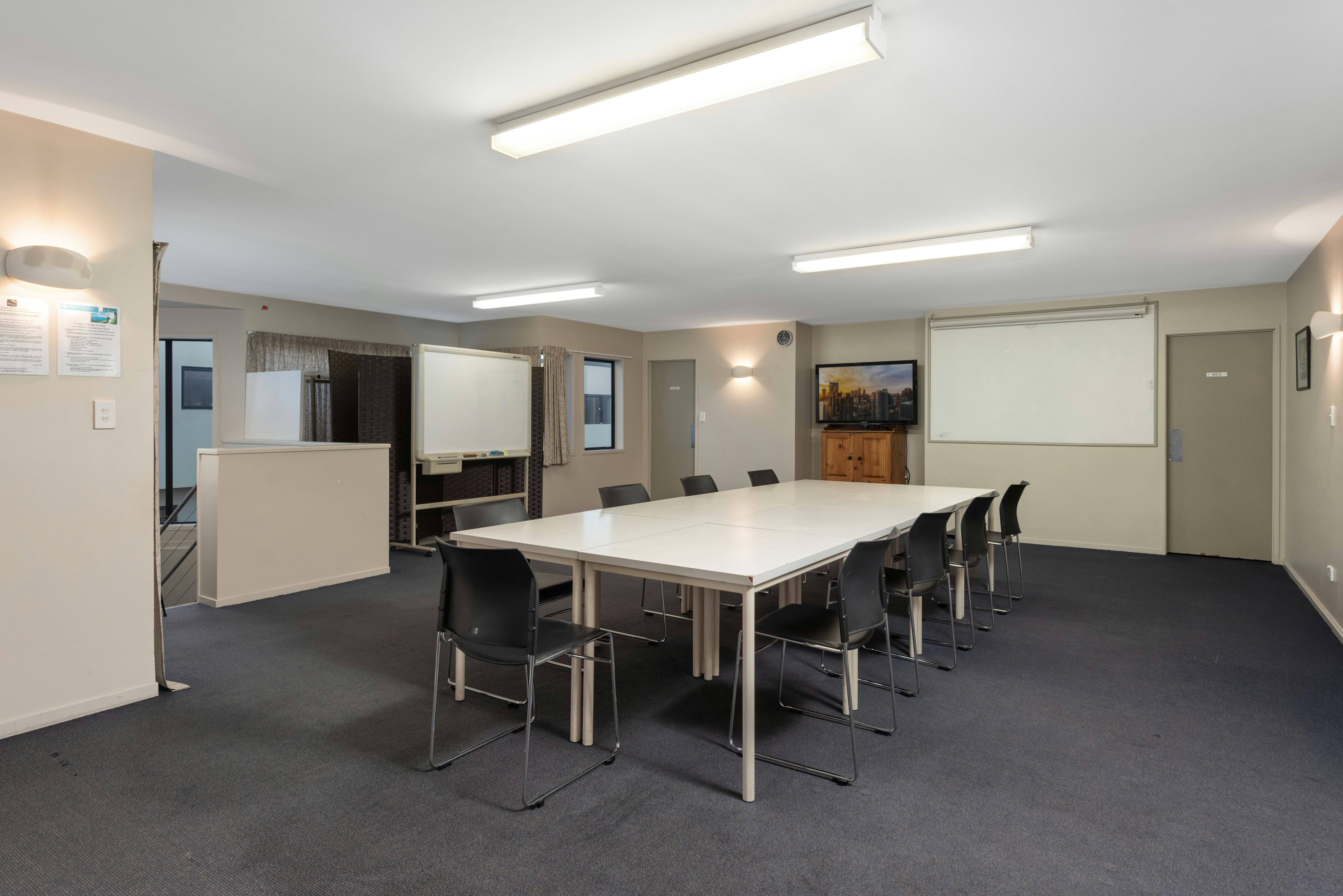 Smaller groups can be seated in varying configurations ranging from Board Room, U-style, Lecture Room style with trestle tables or cabaret style seating for interactive workshops. There are White boards , Tv screen for data display and a Projector for hire if needed.