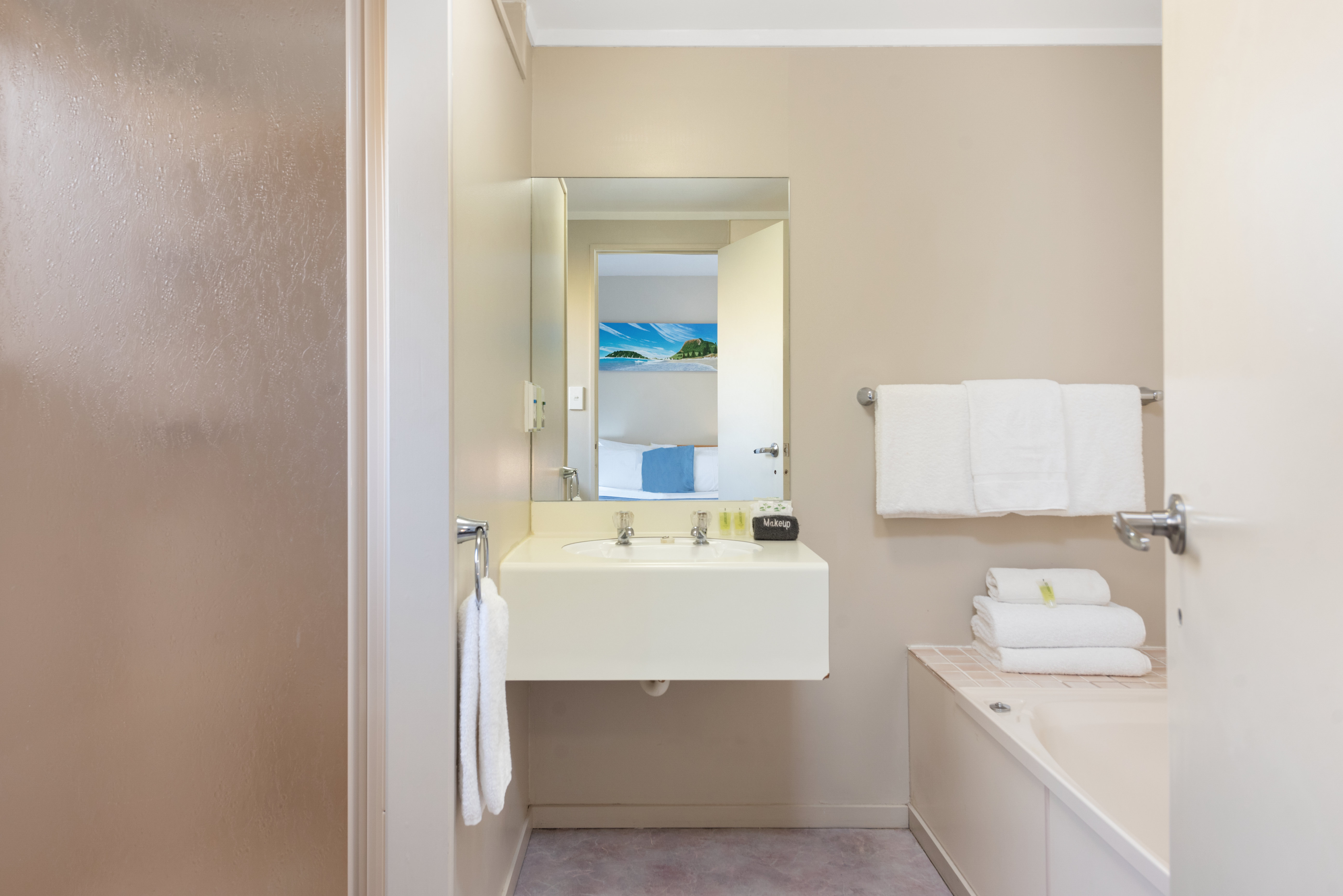 These comfortable units have a queen-size bed in the bedroom, and an en-suite bathroom with a vanity and basin, single spa bath, shower, and toilet. The beds have bedside tables and bedside lamps for any late-night readers.